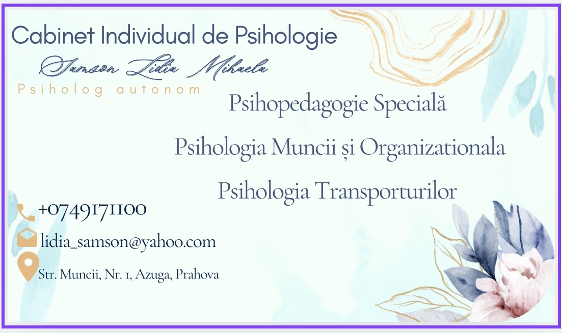 Cabinetul individual de psihologie Samson Lidia oferă servicii de psihopedagogie specială, psihologie a muncii și organizațională, precum și psihologie a transporturilor.